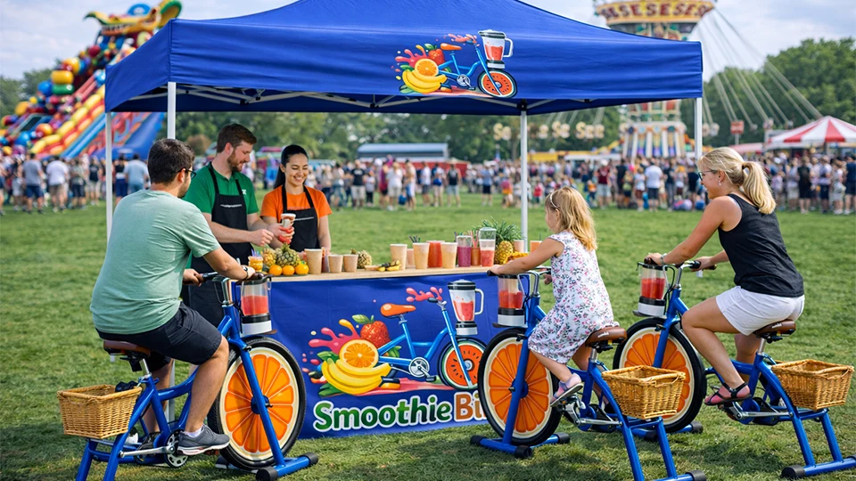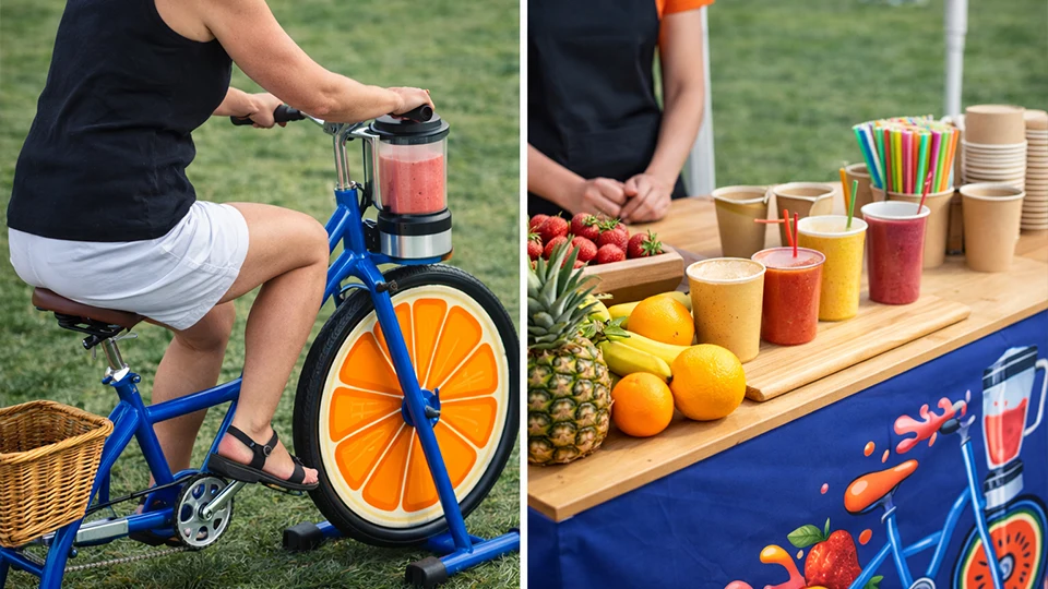Smoothie Bike to również skuteczne narzędzie marketingowe na eventach. Oferujemy możliwość personalizacji atrakcji pod markę klienta – od nadruków na kubkach, przez banery reklamowe, po dopasowanie kolorystyki elementów strefy. Dzięki temu blender bike może pełnić rolę nośnika wizerunku marki i realnie wspierać działania promocyjne podczas wydarzenia.